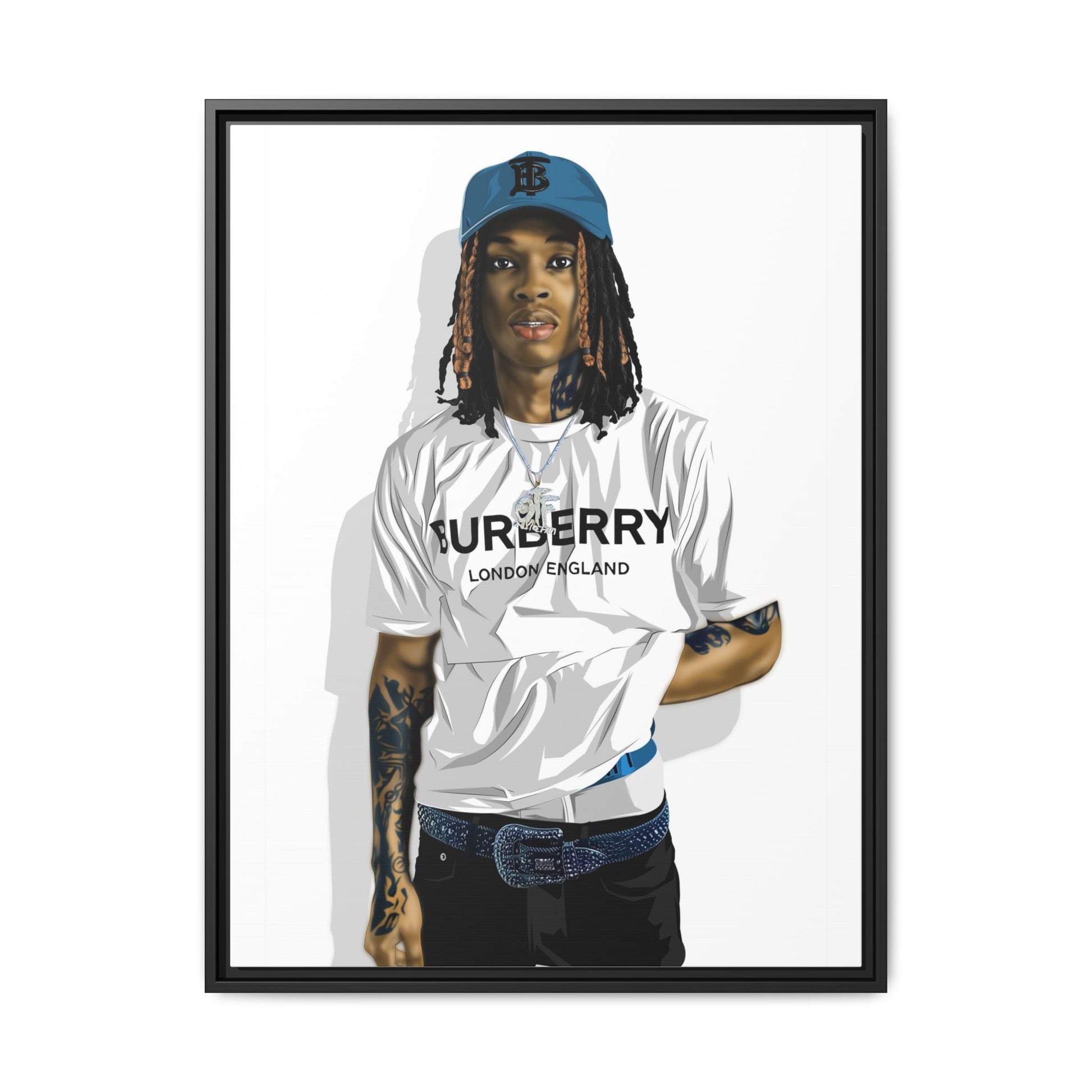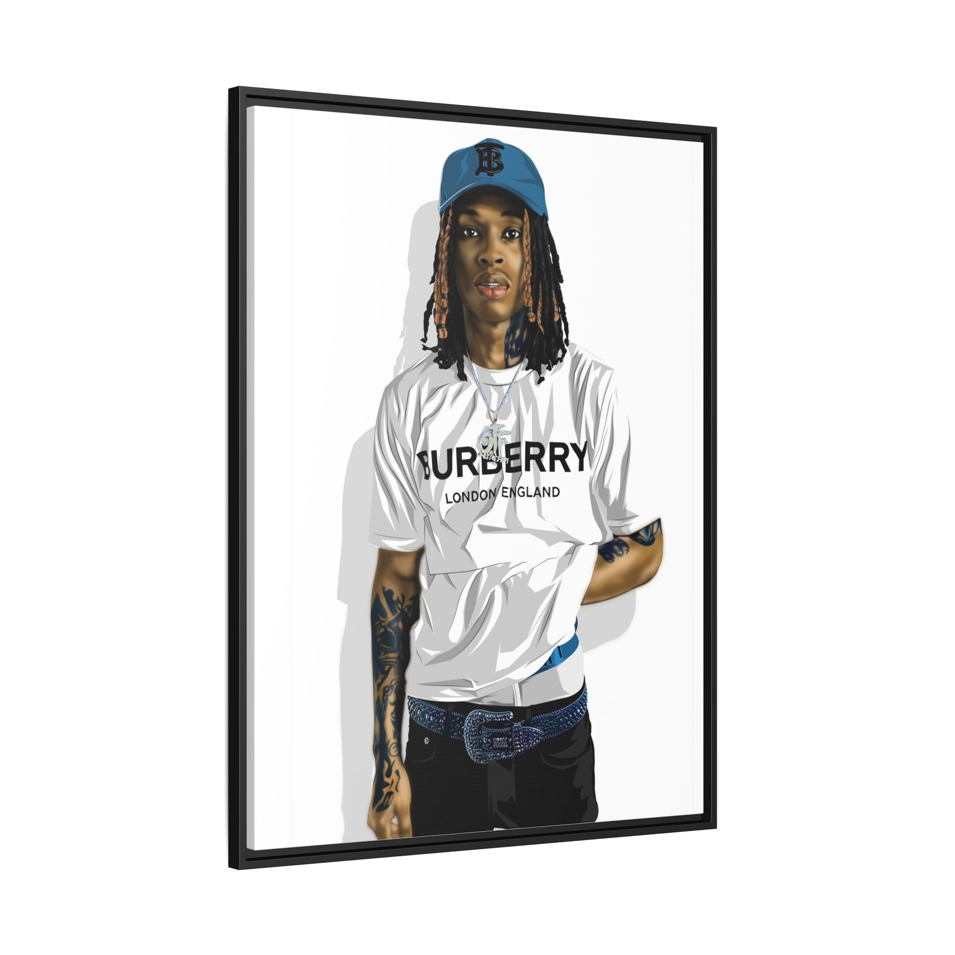 “King Von Legacy” is a bold and captivating digital portrait that honors the unforgettable presence of King Von. Styled in a crisp white Burberry shirt, signature tattoos, and a confident stance, this artwork captures the rapper’s raw charisma and street-bred authenticity. Every detail — from the expressive gaze to the intricate ink and modern fashion elements — is digitally rendered with precision. Set against a clean, minimalist background and framed in sleek black, this portrait brings attitude, culture, and modern artistry into any space. Perfect for fans, collectors, and lovers of urban music-inspired art.”