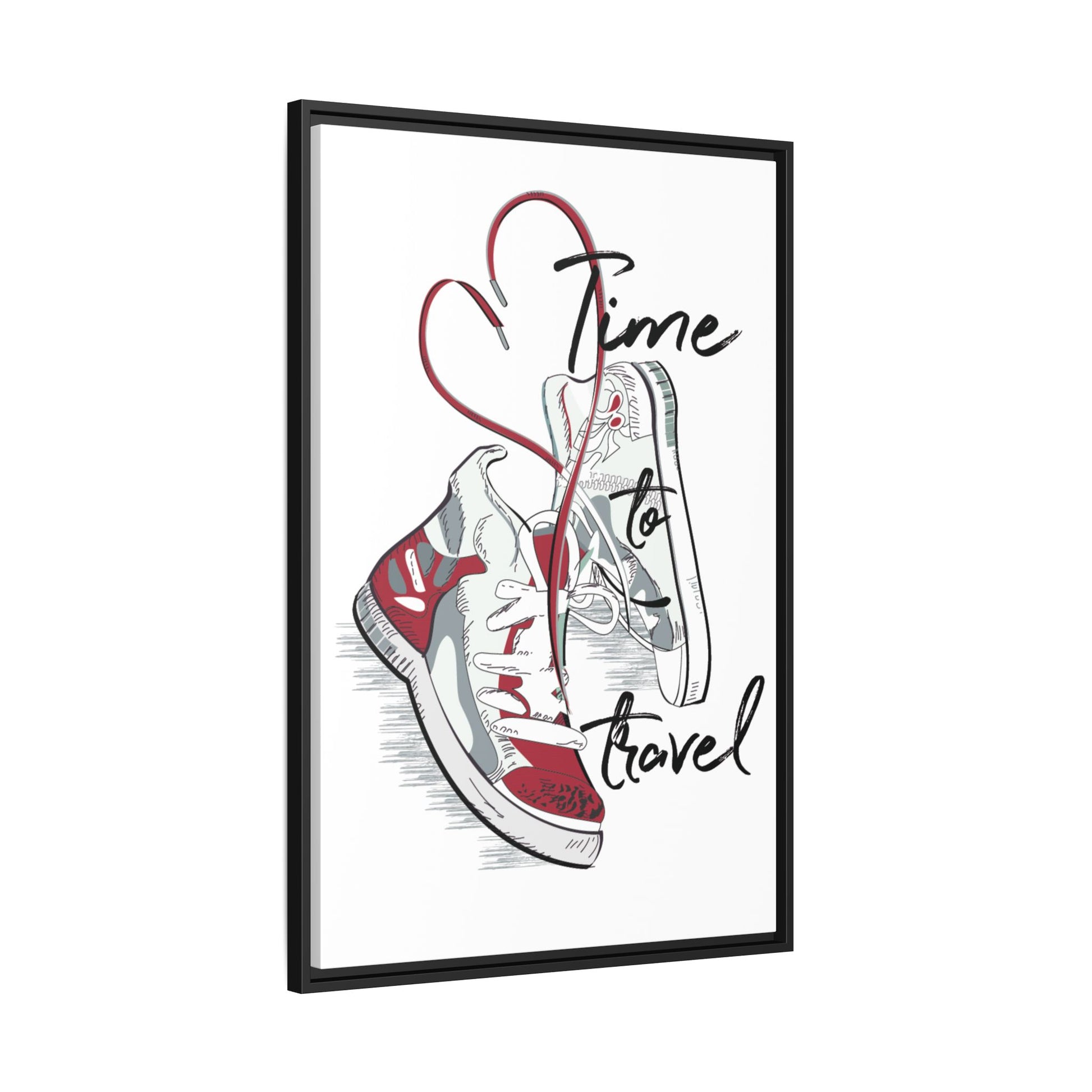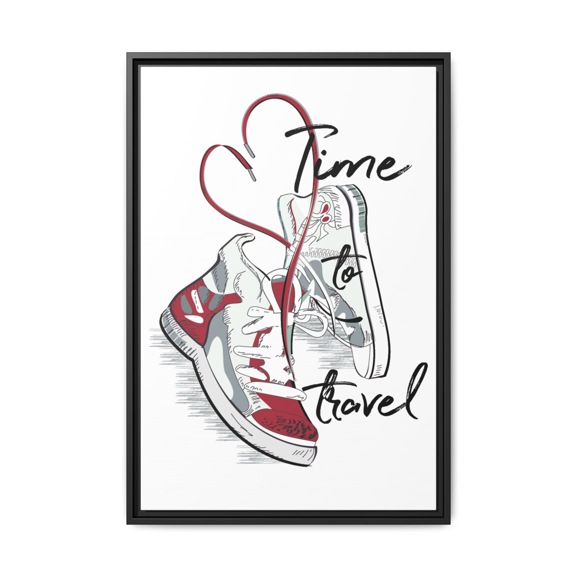 Time to Travel is a minimalist lifestyle illustration that captures the emotion of departure, freedom, and new beginnings. The artwork features a pair of sneakers suspended in motion, their laces forming a heart-like curve that symbolizes love for movement, exploration, and life beyond routine.